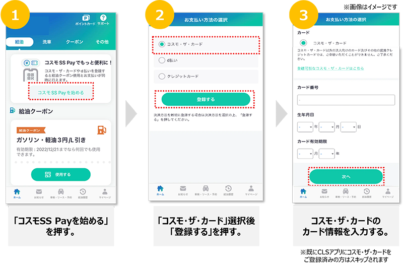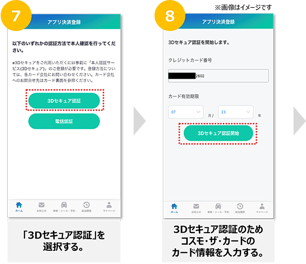 ③コスモ・ザ・カードのカード情報を入力する。(※既にアプリにコスモ・ザ・カードをご登録済みの方はスキップされます)
