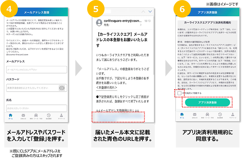 ④メールアドレスやパスワードを入力して「登録」を押す。(※既にアプリメールアドレスをご登録済みの方はスキップされます)