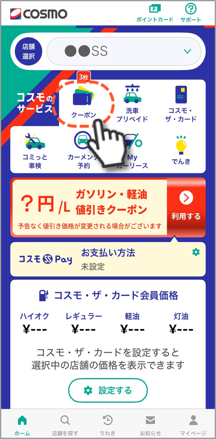 1.ホーム画面の「クーポン」をタップ