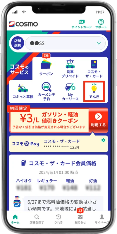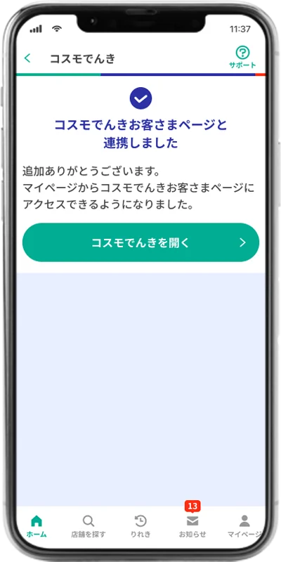 ホーム画面の「でんき」のアイコンから、コスモでんきお客さまIDとパスワードを連携いただくと、アプリから簡単に「コスモでんきお客さまページ」にログインすることができます。ご家族等を招待することで、ご家族等もアプリから簡単に「コスモでんきお客さまページ」にログインすることができます。