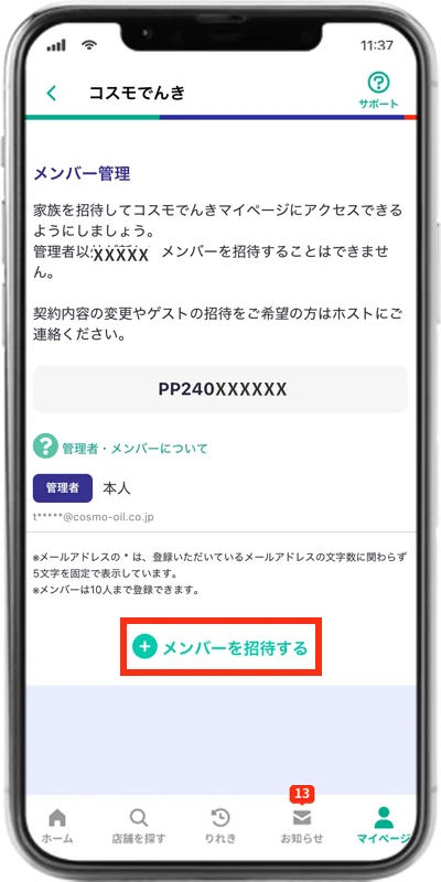ご家族等を招待する事で、ご家族等もアプリから簡単に「コスモでんきお客さまページ」にログインすることができます。