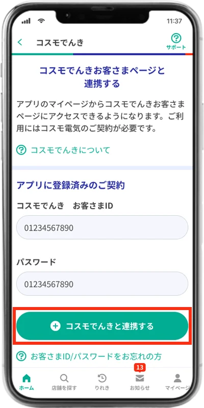 お客さまIDとパスワードを入力し「コスモでんきと連携する」をタップ